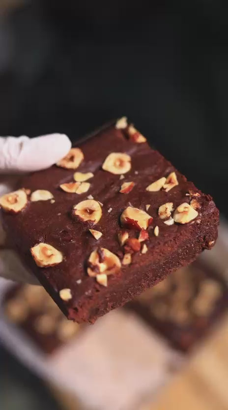 Dark, fudgy, nutty — and just a little bit sneaky. This brownie is loaded with 70% dark chocolate, sweetened with a clever combo of monk fruit and khaand (no refined sugar here), and topped with a generous scatter of crunchy hazelnuts. It’s gluten-free, completely eggless, and way more indulgent than it lets on.
